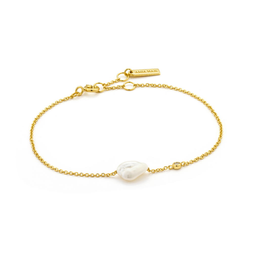 The everyday way to do pearls, choose a delicate chain bracelet finished with our signature baroque fresh water pearl. A unique and asymmetrical shape pearl is flanked by a single cubic zirconia stone for just enough sparkle. Perfect for stacking with chains or bangles or wearing solo as the main event.
