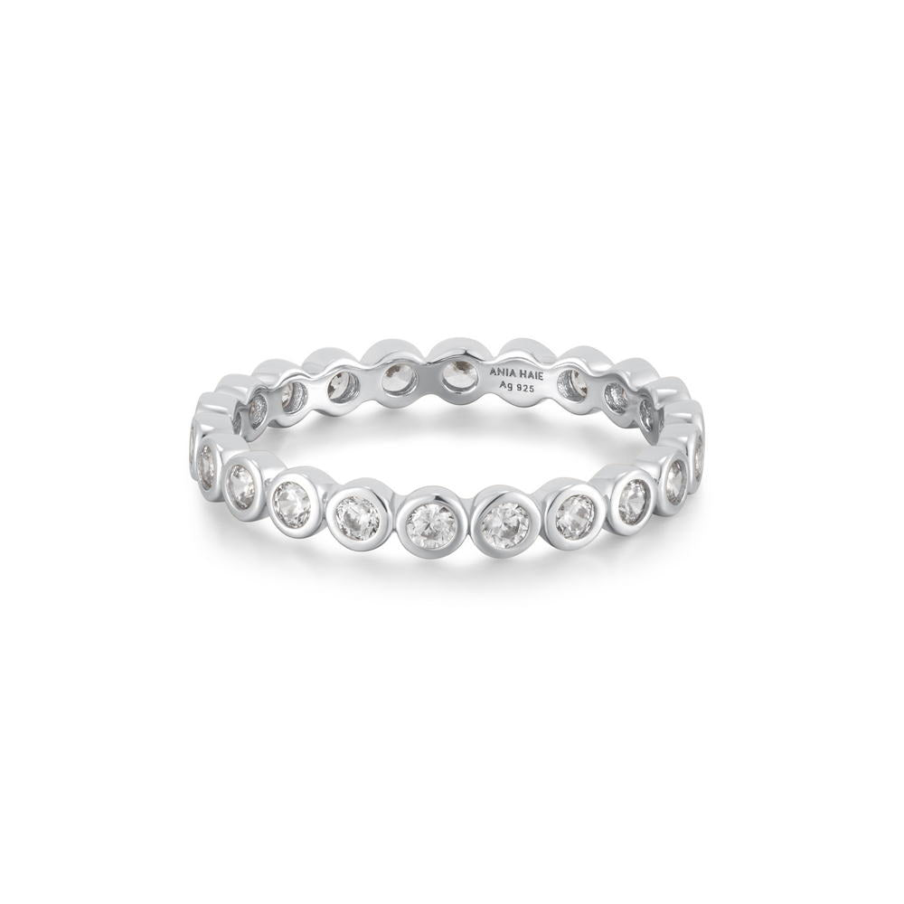 Designed to be a wardrobe essential, the bezel set ring features a band of cubic zirconia in rhodium plated sterling silver. It looks brilliant worn alone or stacked with yours, effortlessly suiting your everyday wear.