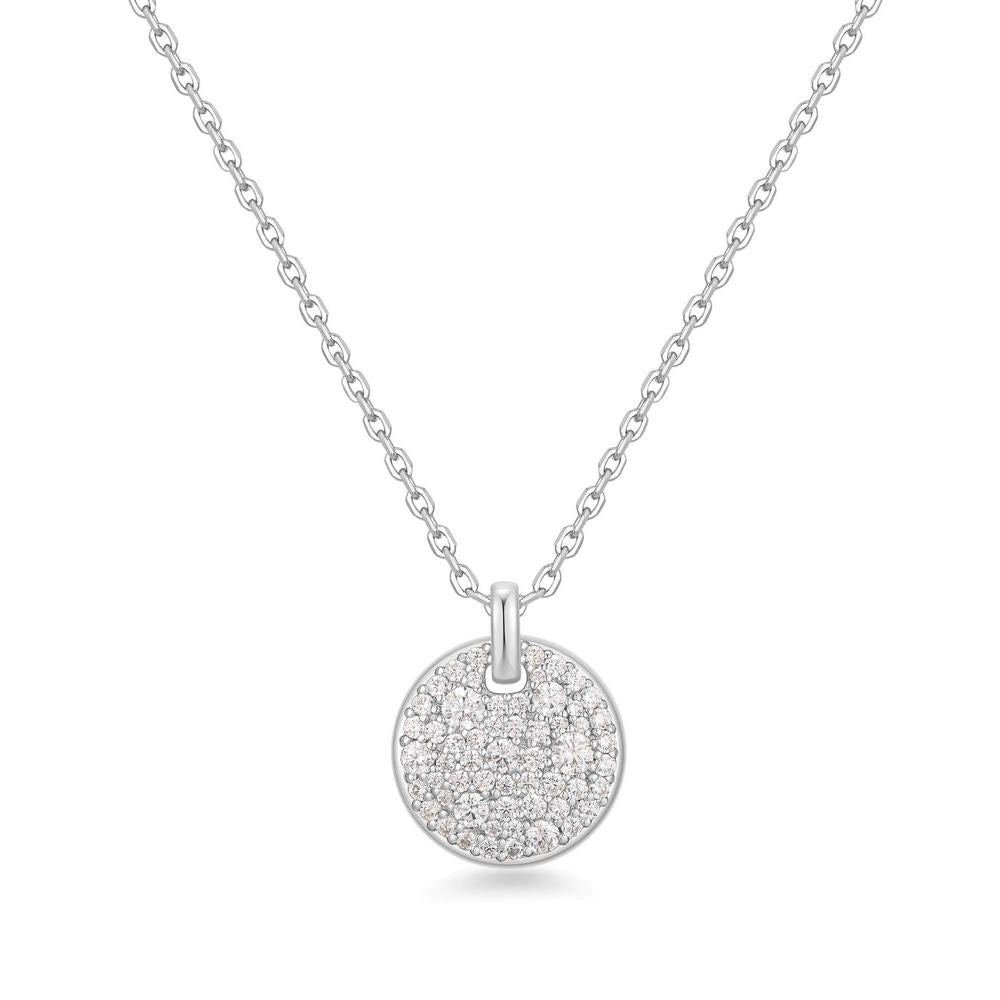 Elevate your style with this chic and eye-catching pavé disc necklace. Designed to shine brilliantly, it adds a dramatic yet subtle touch to any outfit. Pair it with a pearl necklace and a chunky chain to make a strong impression. Whether for special occasions or everyday wear, this necklace ensures you stand out with sophistication and poise.